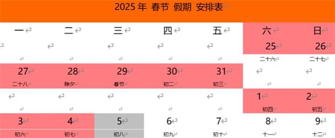 放假時間為2025年1月25日(農(nóng)歷臘月二十六)至2月4日(農(nóng)歷正月初七),共計11天 。2月5日(農(nóng)歷正月初八)正式上班。
